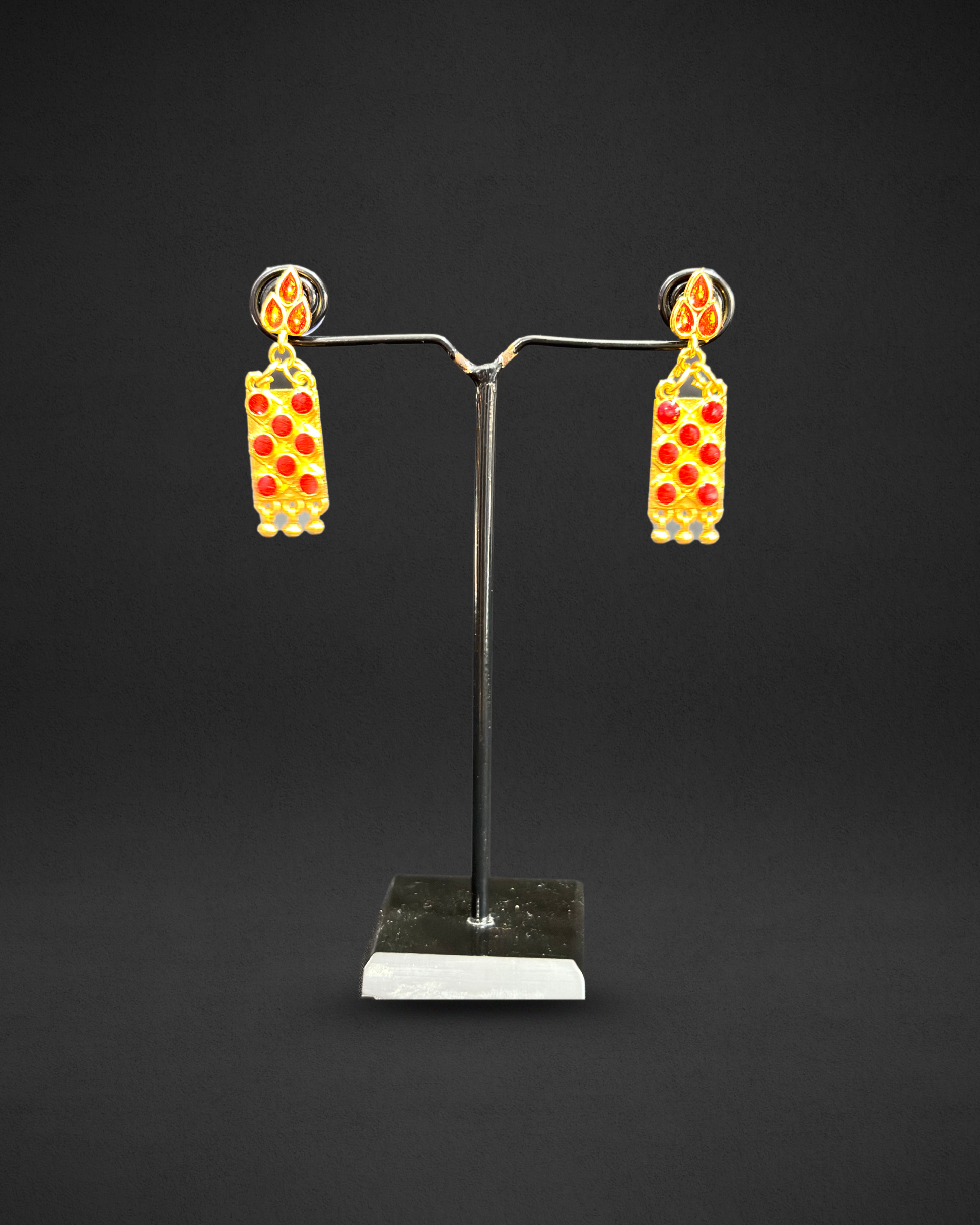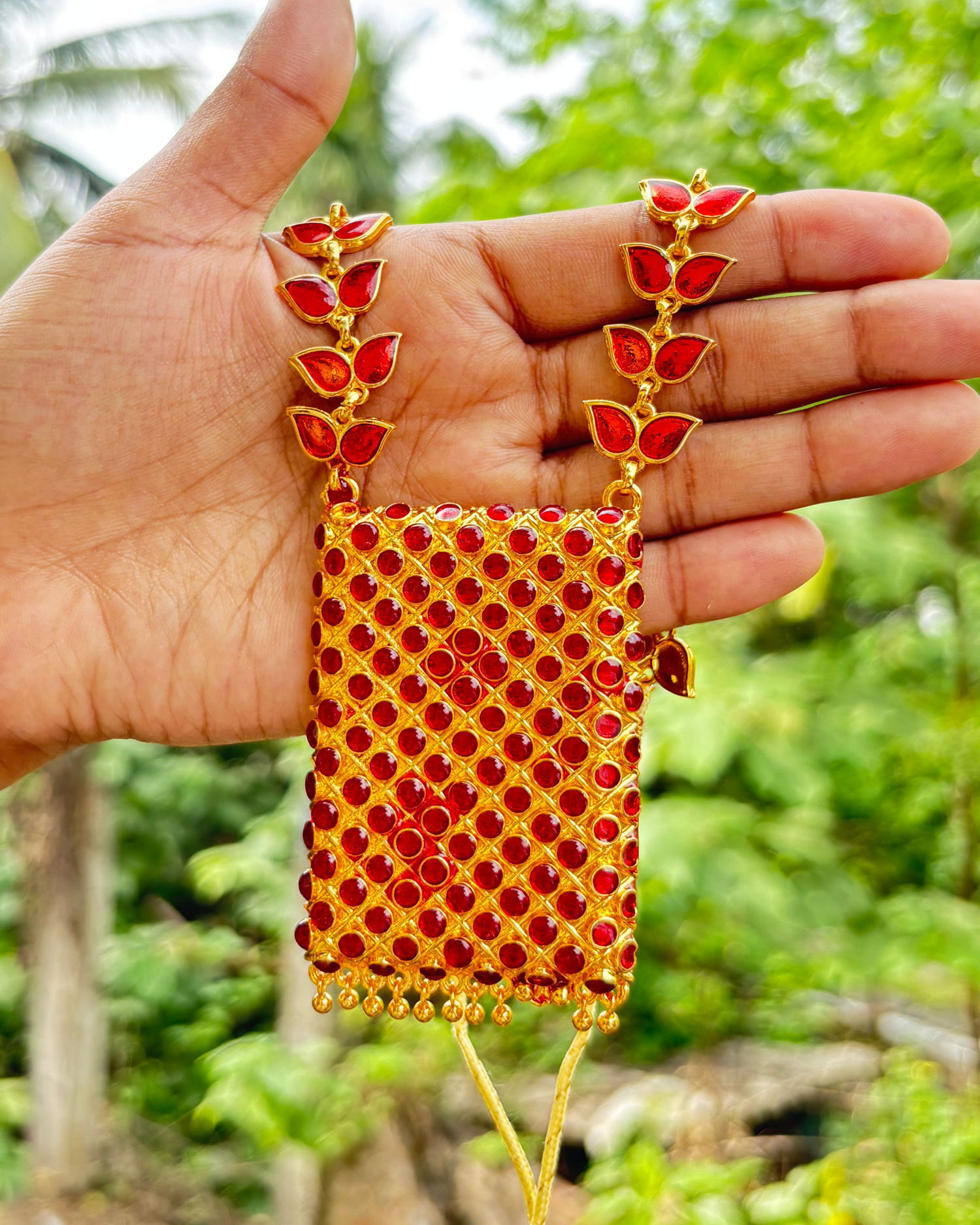 Step into timeless elegance with this exquisite Assamese Red Golpata Traditional Necklace, a handcrafted masterpiece inspired by Assam’s rich cultural legacy. Featuring a gold-polished rectangular pendant studded with red enamel stones, this jewellery piece embodies luxury, tradition, and craftsmanship.